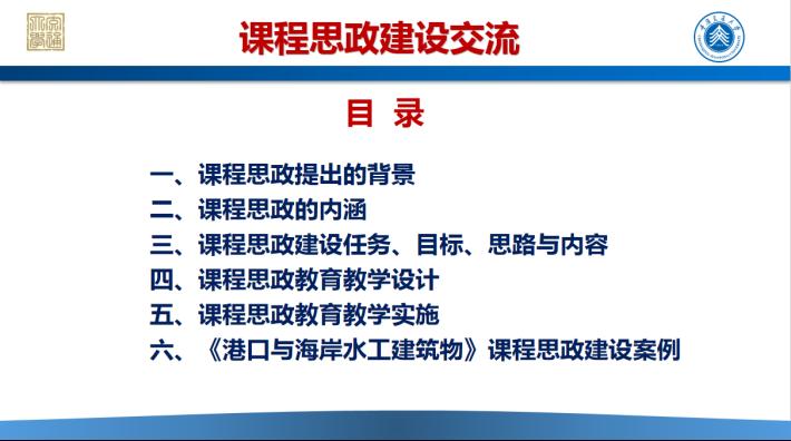 交流会上,王多银教授从课程思政提出的背景出发,阐述了高等教育的3个关键问题。同时指出课程思政本质不是要改变专业课程的主要属性,更不是要把专业课改变为思政课模式,而是充分发挥专业课程的德育功能,运用辩证唯物主义思想和方法,挖掘学科专业的思政资源,提炼专业课程中思政元素,提升专业课程教育教学的思想政治育人文化,将立德树人的育人理念有效融入专业教学,使学生在“润物细无声”的知识学习中得到理想信念、价值塑造、职业素养等培养。进一步明确了课程思政建设任务、目标、思路与内容,提出了教学设计原则和实施方案,更进一步凝练出针对文史哲类、经管法类、理工类、教育学类、农学类、医学类、艺术类7大类专业课程的教学设计要求。最后以《港口与海岸水工建筑物》重庆市课程思政示范项目为例,为大家展示了如何将思政元素融入课堂的生动案例。