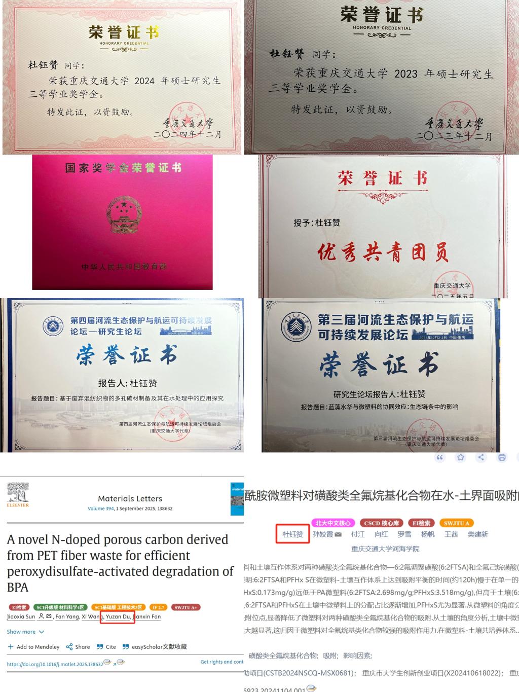 杜钰赞,河海学院2023级环境科学与工程专业硕士研究生,一班组织委员。综合成绩排名前列,曾获得包括2025年国家奖学金、多次校级学业奖学金、“重庆交通大学优秀学生干部”、“重庆交通大学优秀共青团员”、“重庆交通大学科技创新先进个人”在内的各种奖励及荣誉。参研国家级与重庆市科研项目3项。公开发表SCI论文1篇,以第一作者身份发表在《中国环境科学》期刊1篇。曾在第三、四届河流生态保护与航运可持续发展国际论坛等多次学术论坛中进行汇报。