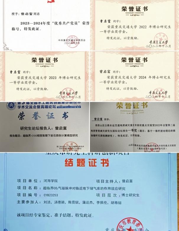 曾启富,河海学院2022级水利工程在读博士研究生,中共党员,曾获包括优秀共产党员、重庆交通大学国家奖学金、重庆交通大学学业奖学金、重庆交通大学“三好学生”、重庆交通大学“科技创新先进个人”等在内的荣誉称号及奖励,主持并完成重庆市科研创新项目1项,参研国家自然科学基金项目2项。公开发表SCI/EI论文6篇,授权/申请国家发明专利4项,软件著作权2项,参加第二十一届中国岩石力学与工程学术年会、第九届全国水工岩石力学大会、第二届地质智能减灾研究生国际论坛及第三届全国水工建筑物健康诊断技术学术交流会暨高端论坛等会议并作学术报告。