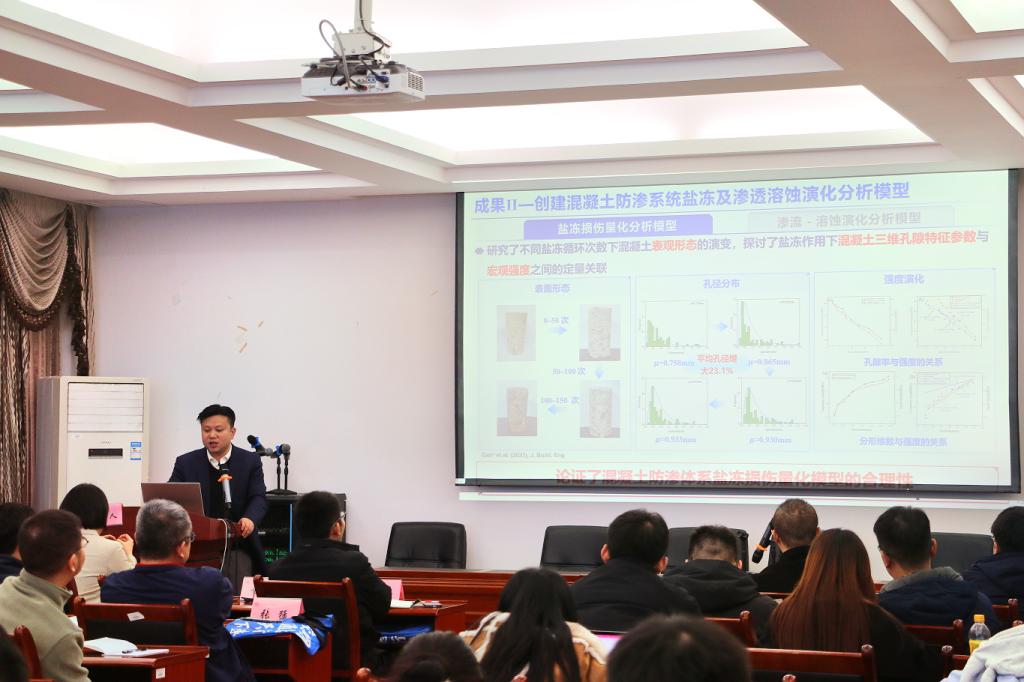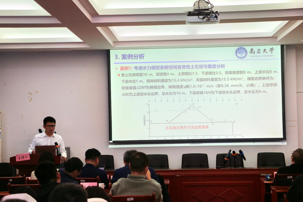 第一阶段学术报告由梁越教授主持,蒋水华教授作了题为“考虑多参数空间变异性的土石坝时变可靠度分析”的报告,详细介绍了一种非侵入式随机有限元方法,这种方法能够高效分析坝体与坝基材料参数时空变异性的影响,并降低土石坝时变可靠度分析的计算负担;甘磊教授以“深厚覆盖层高面板坝防渗系统长效性能评估方法”为题,详细介绍了水泥基防渗材料长效性能试验装置和测试技术、混凝土防渗系统盐冻及渗透溶蚀演化分析模型,并对深厚覆盖层高面板坝防渗系统长效性能进行了展望。