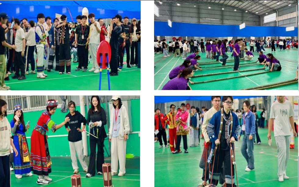 本次民族团结趣味运动会精心设计了七大民族特色项目,各民族师生以学院为单位进行整体比拼。汉族投壶承袭古礼,彰显君子之风;蒙古族射箭展现草原儿女的豪迈与精准;壮族走板鞋考验团队协作;傣族丢包传递情谊,体现傣族青年的社交智慧;跳竹竿节奏明快,展现黎族青年的灵动与默契;顶碗竞走和铁环滚滚则融合多民族传统元素,兼具趣味与挑战。每一个项目不仅是一场竞技,更是一次民族文化的生动展示与传承。