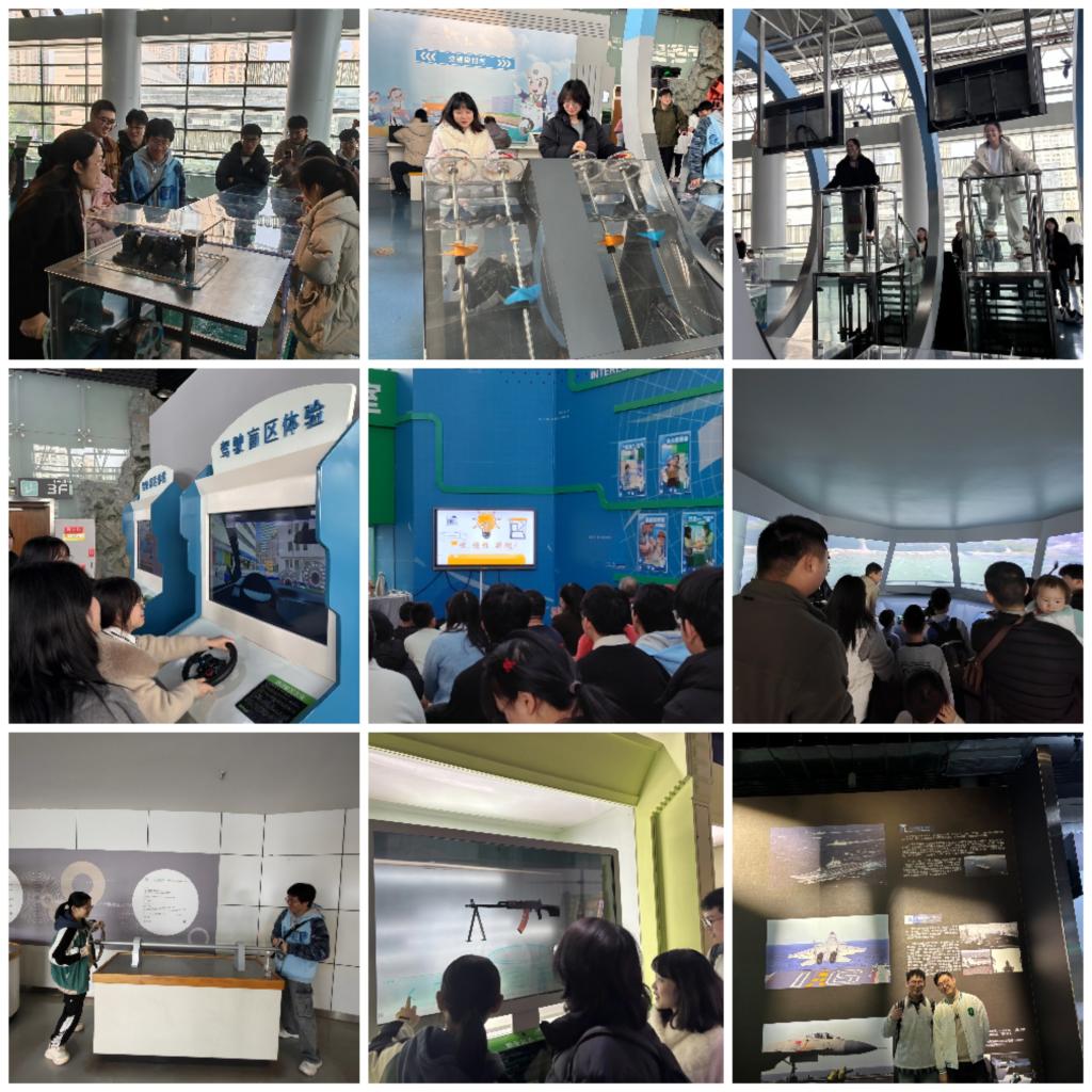 在国防科技展厅,航空母舰、舰载机等军事科技模型与成果展示吸引了众人的目光。结合福建舰 2024 年首次海试、2025 年入列授旗的重大事件,党员们现场交流心得体会。研究生第六党支部党员杨加保表示:“从辽宁舰、山东舰到福建舰,每一艘航母的服役都是国家科技实力的体现,作为水利领域研究生,我们更应以‘攻坚克难’的精神投身科研。”其发言引发了大家的共鸣。此前在防灾科技展厅的体验也让他感触颇深:“洪水模拟体验十分直观,看到科技能够实现精准预警、科学调度,让我更加坚定了将研究生课题聚焦于‘西南山地流域灾害防控’的决心,要让专业知识切实服务于地方安全。”