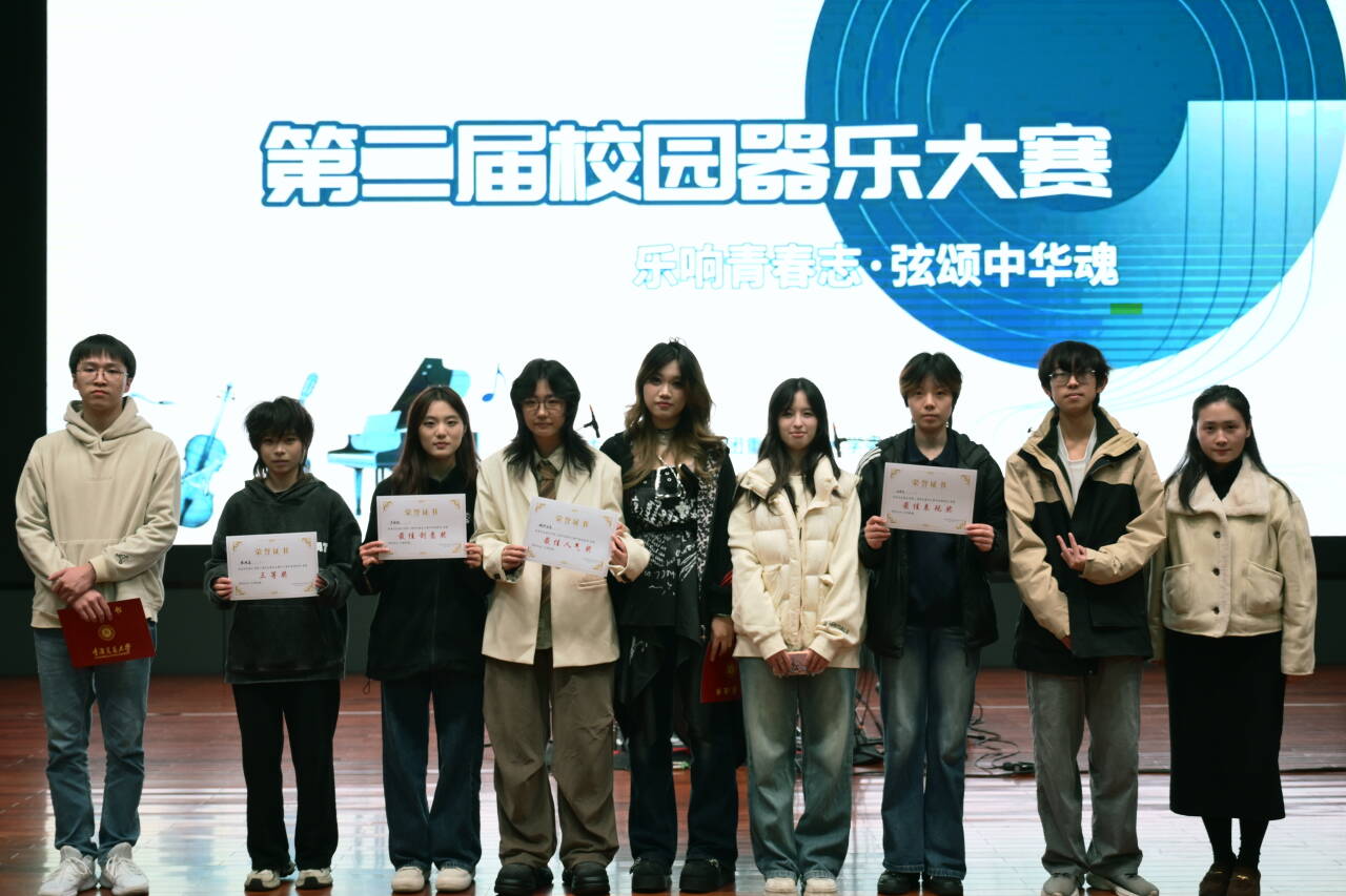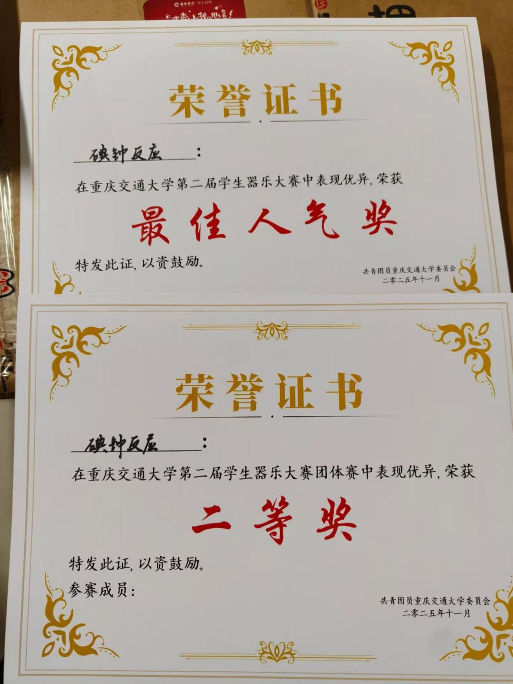 2025年11月20日晚,在重庆交通大学科学城校区学生活动中心二楼举办的第二届校园器乐大赛“乐响青春志 弦颂中华魂”上,我院碘钟反应队成功斩获团体二等奖和最佳人气奖。