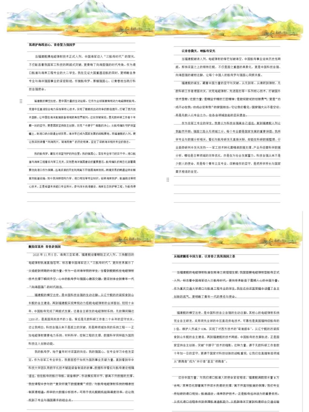 在主题演讲环节,我院学子围绕“福建舰”入列设置系列议题,展开演讲。演讲以“时代召唤与里程碑”开篇,明确新时代的背景与使命;随后聚焦“青年担当与奋斗路径”,探讨青年一代的责任与实现价值的途径;进而深入解读“强军思想与百年目标”,阐明国防建设与国家发展的紧密关系;最后,会议将以“总结与行动倡议”作为收官,凝聚共识,号召全体参与者将理论转化为实践,为实现宏伟目标而共同奋斗。