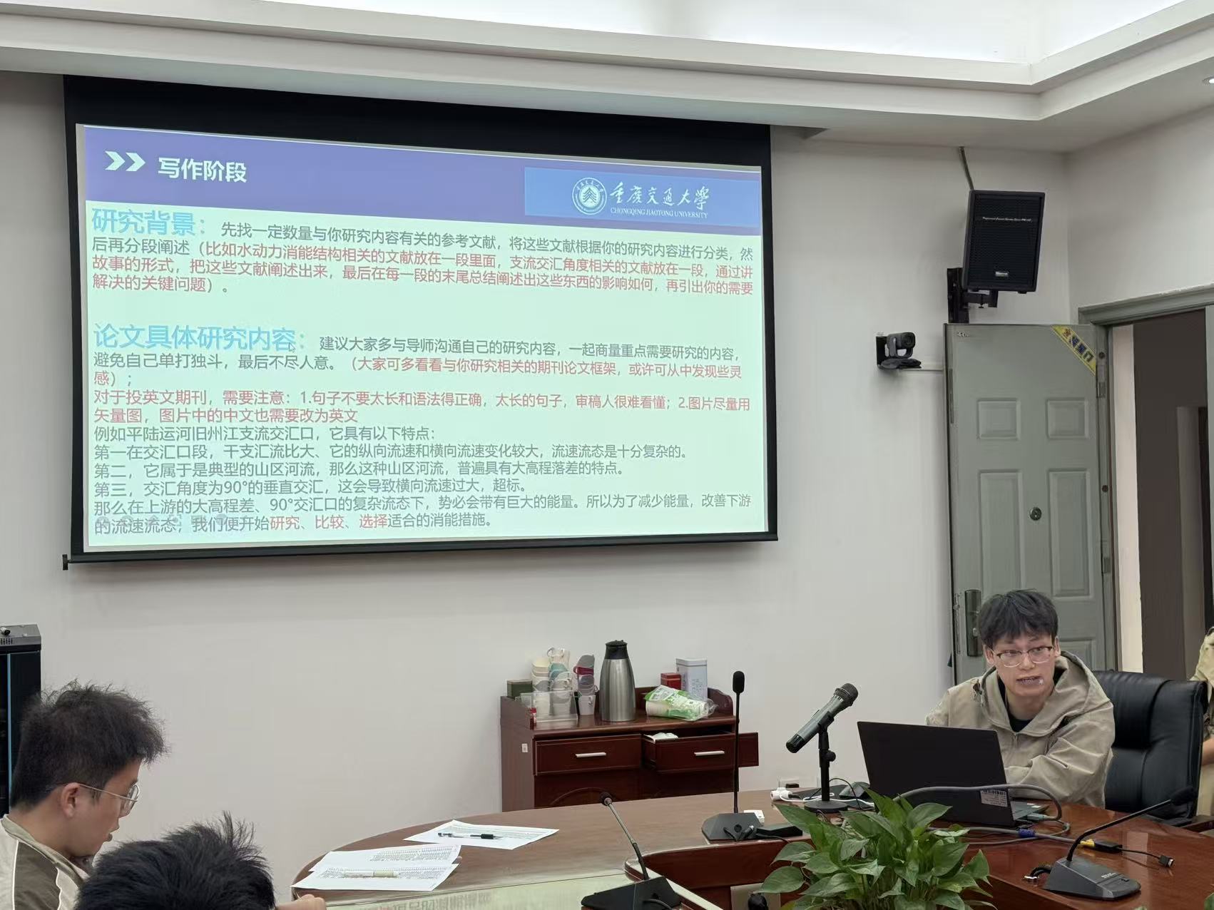 分享会现场座无虚席,同学们热情高涨。2023级水利硕士研究生翟梓轩,从论文写作、投稿经验和学业规划三部分来分享了他的研究生经验:强调科研制图的基本要求、示范制图常用软件、使用ChatGPT+Python一键出图+润色,并忠告“选刊先看影响因子和同类文章,返修就是编辑递来的第二次高考,认真改就能上岸”。