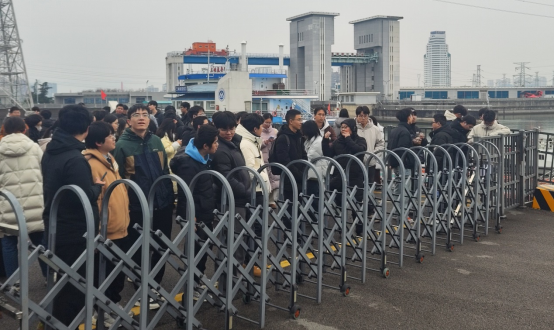随后,师生抵达葛洲坝航道,现场观察船舶通过船闸的全过程,学习航道分级标准与配套设施的工作原理,重点了解被称为“天下第一门”的一号船闸结构,以及冲沙闸在防洪淤积、保障通航安全方面的协同设计。