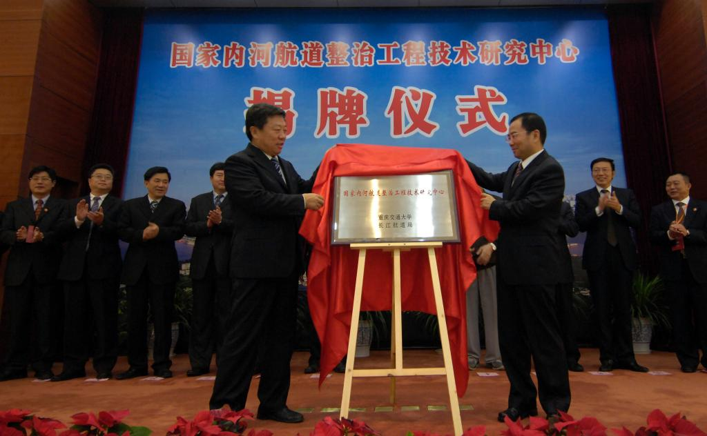 进入新世纪,“黄金水道”战略上升为国家部署,西南内河航运的发展迎来了新的机遇,也面临着更大的挑战。长江上游河道弯多滩险,泥沙淤积严重,高水位差枢纽港口的通航难题长期制约着航运效率;而随着生态保护意识的提升,如何在航道开发与生态保护之间找到平衡,成为亟待破解的课题。重庆交通大学主动担当,与长江航道局携手,向着建设国家级科研平台的目标奋进。2011年,科技部正式批复建设“国家内河航道整治工程技术研究中心”。揭牌仪式上,重庆市副市长吴刚和交通运输部副部长高宏峰共同揭开红绸,现场掌声雷动。从简陋河工间到国家级平台,研究中心的团队肩负的不仅是科研任务,更是西南水运发展的重任。阳光洒在研发大楼的玻璃幕墙上,折射出的光芒,照亮了交大人逐浪通江的新征程。